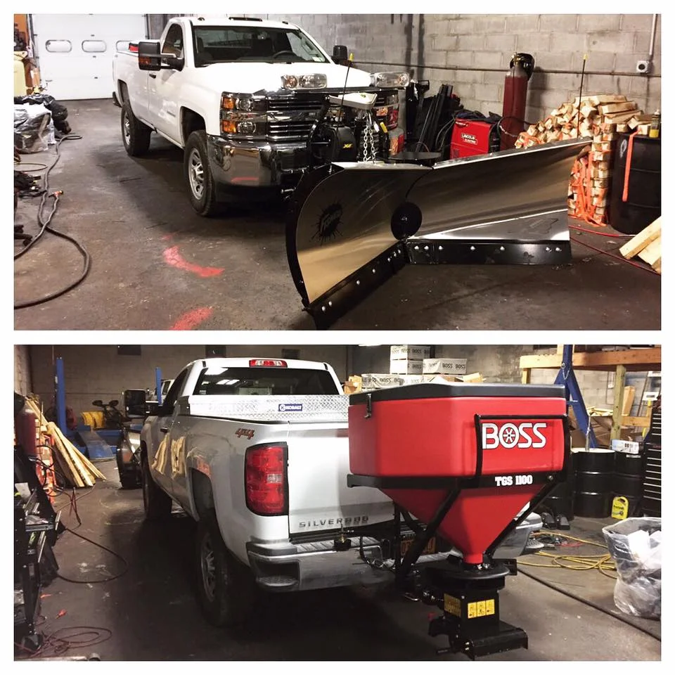 The paint was still wet on this freshly built 2018 Chevy 2500HD that we added a new 8-1/2' Fisher XV2 on the front and Boss TGS1100 spreader on the back. Some may question the mismatched brands but the RT3 hook up of the Boss salter was irresistible for this customer.