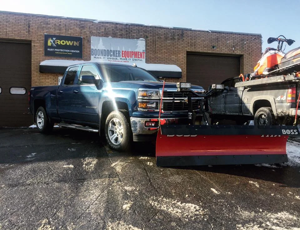Red plow, white snow, and blue truck. We even got what looks like a star shining in the all American truck. This 2015 Chevy 1500 came in all stock today but left with a loaded up 7-1/2' Boss HTX with Rubber Deflector, shoes, back drag edge, 2" leveling kit and Krown Rust Protection.