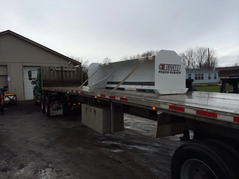 Big lots can be too much for a plow truck. The Power Pusher by Blizzard is a great addition to a skidsteer, loader, or backhoe to get the job done fast! This 12' backhoe model is on it's way to keep McIntosh Box & Pallet open no matter how much snow falls.